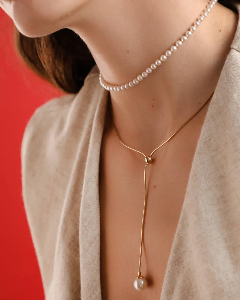 Collar ajustable de 37/42cm de largo. Cadena en plata bañada en oro de 18k con perla redonda blanca de 10mm.