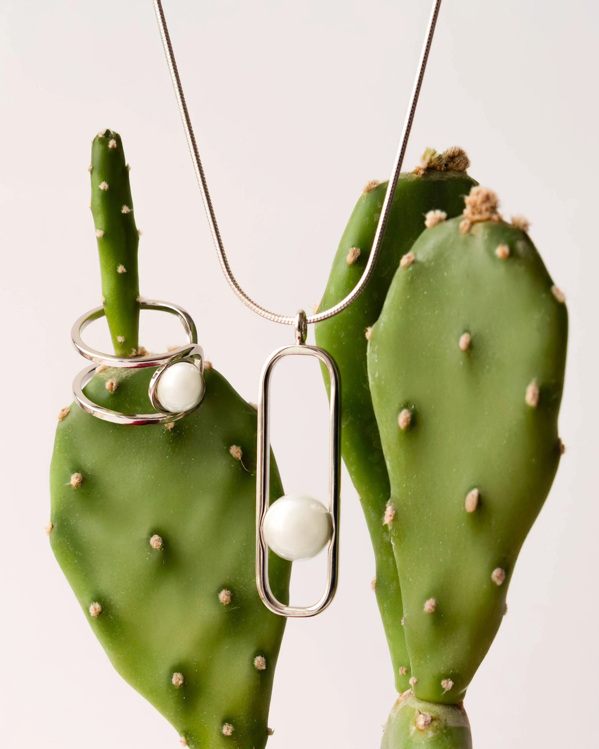 La colección Atenea combina perlas redondas y media bola blancas con estructuras de formas ovaladas abiertas de plata para crear un conjunto irresistible de accesorios. Y es que es ese contraste justo el que hace aún más especiales a sus piezas, en perfecta sintonía entre lo clásico ya presente siempre en la perla y las líneas fluidas tan vanguardistas que dan vida a los diseños.