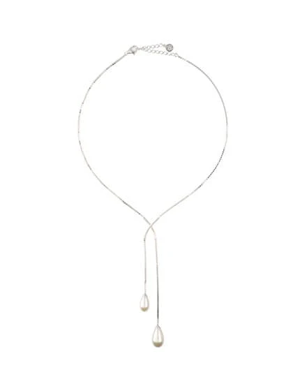 Collar corto de 37/42cm en plata, con dos perlas en forma de pera, en color blanco, de 10x18 y 7x14mm cada una. Una colección de exquisita finura donde las joyas muestran un equilibrado diseño que decorará tu cuello con sofisticación.