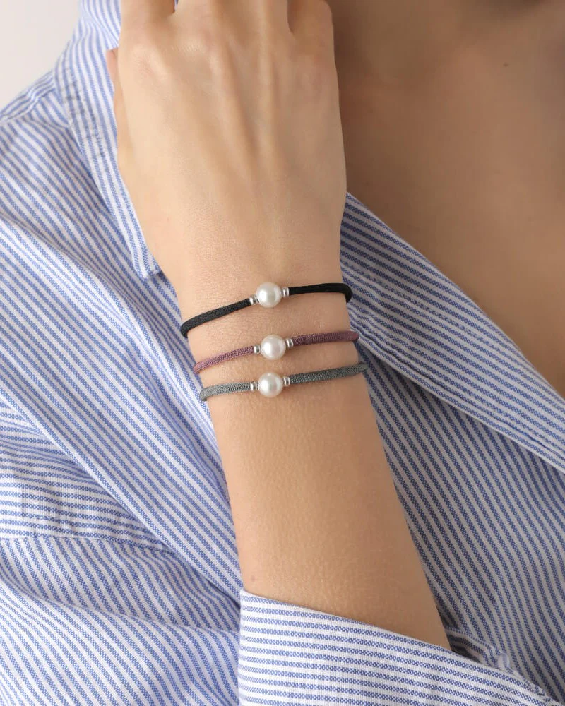 Brazalete elástico de 20 cm ajustable en color negro, perla redonda blanca de 8 mm.. La colección Sifnos es un tributo a la fuerza y empoderamiento.
