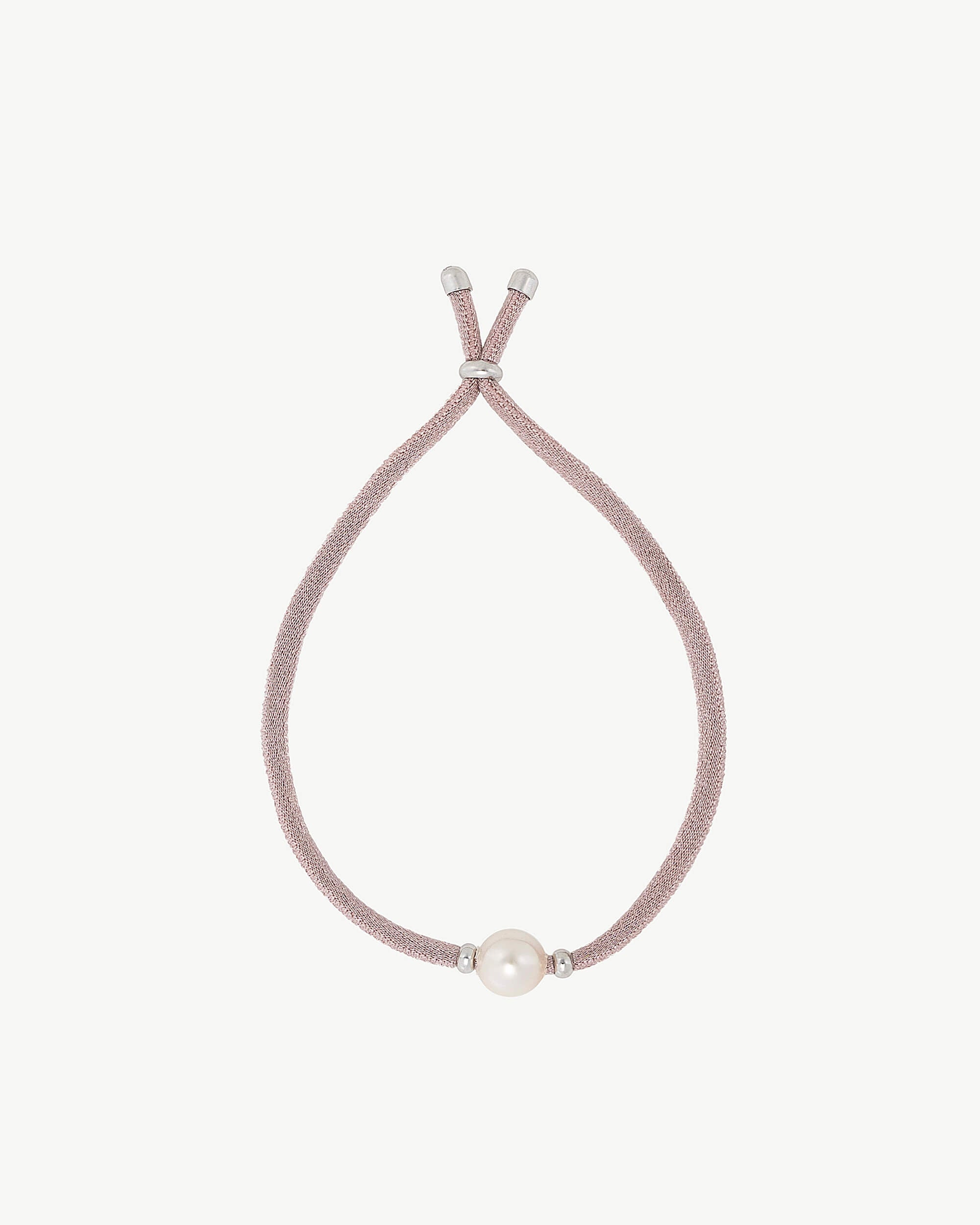 Brazalete elástico de 20 cm ajustable en color rosa, perla redonda blanca de 8 mm.. La colección Sifnos es un tributo a la fuerza y empoderamiento.